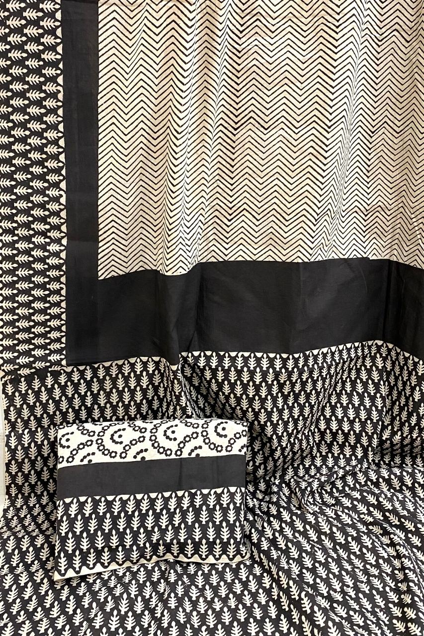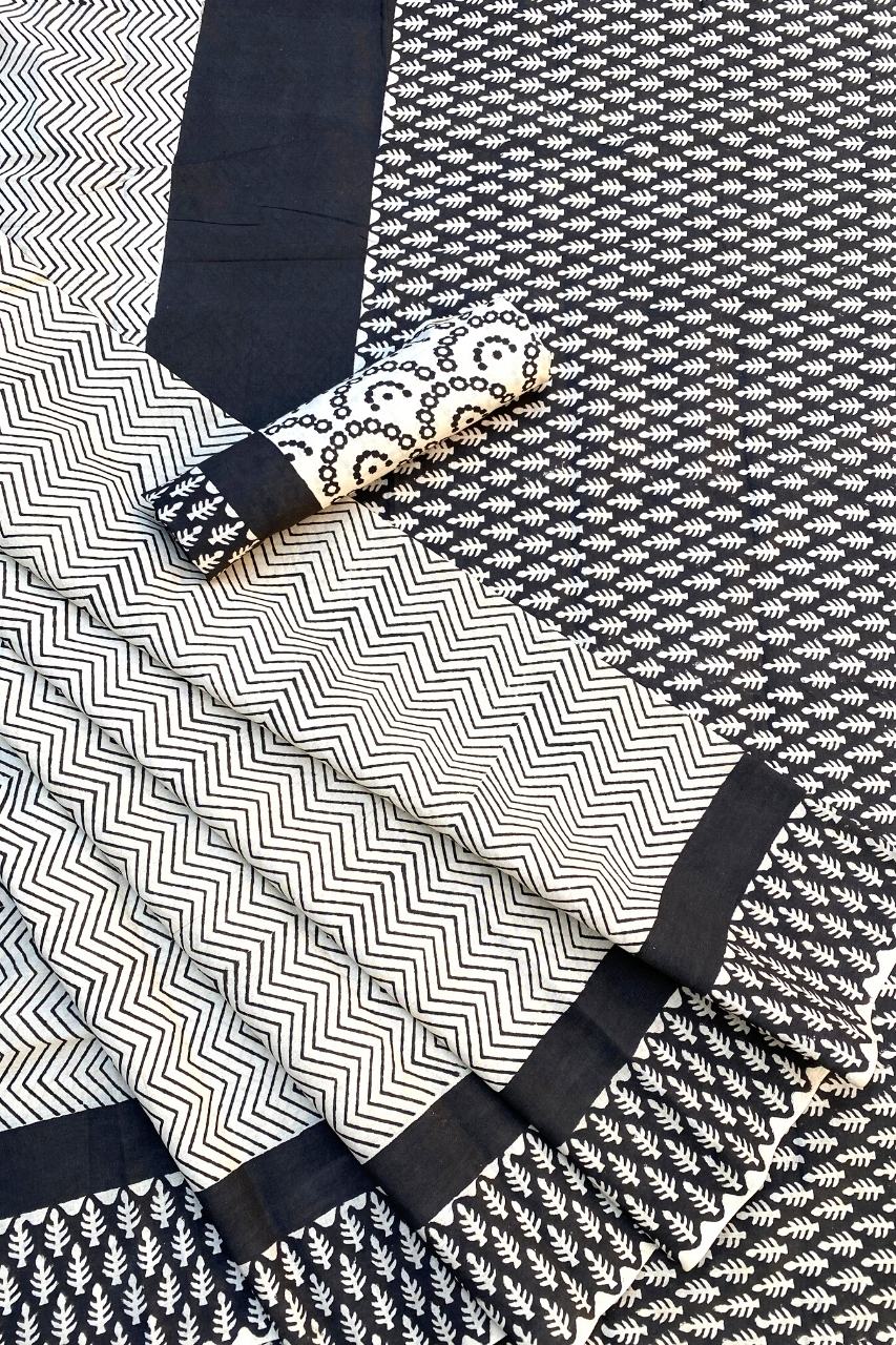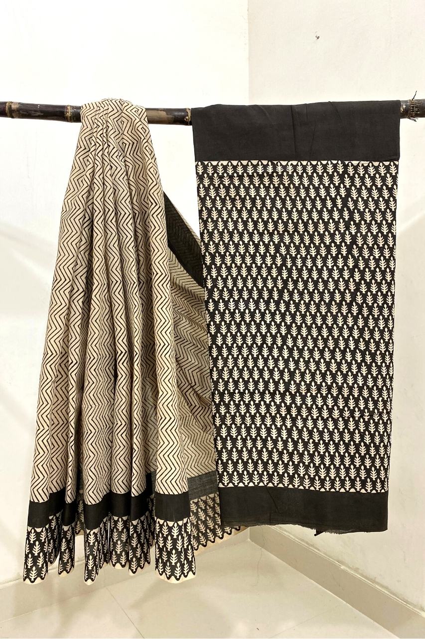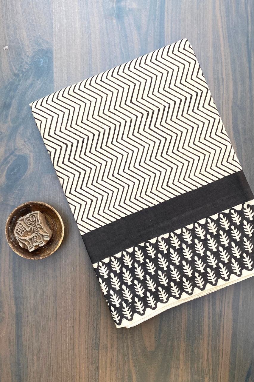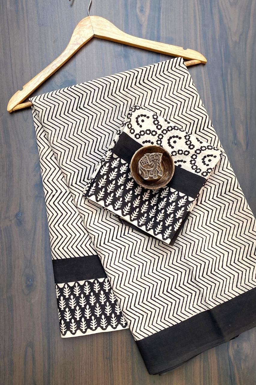 Bagru Lehriya With Small Butti Off Cream Base With Black Colour Small Buuti Border Block Print Saree